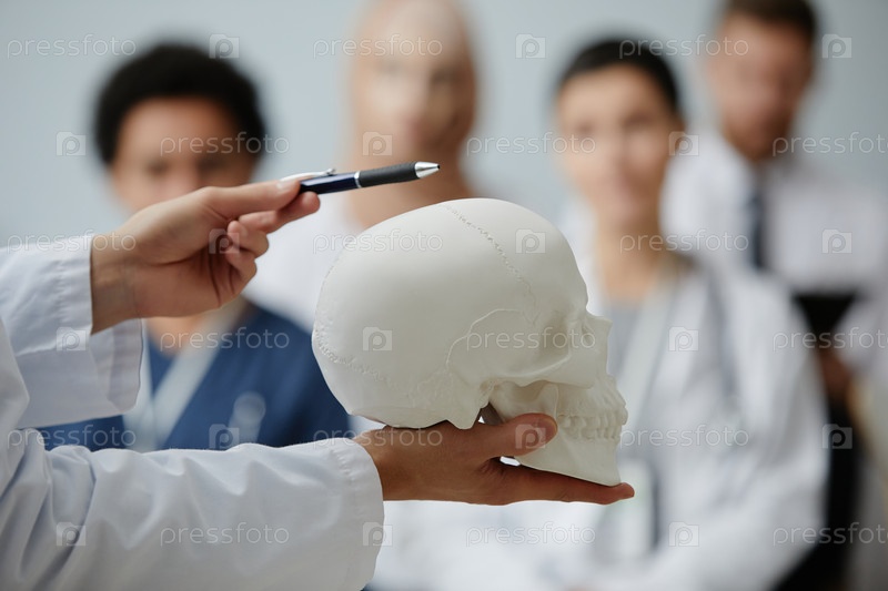 Доктор держит модель черепа и читает лекцию