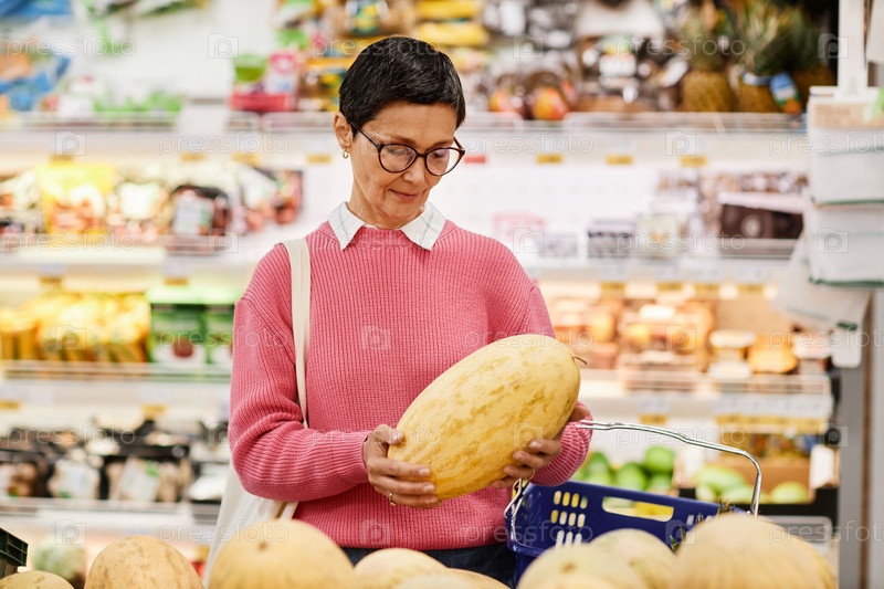 Женщина держит большую дыню, покупая продукты в супермаркете