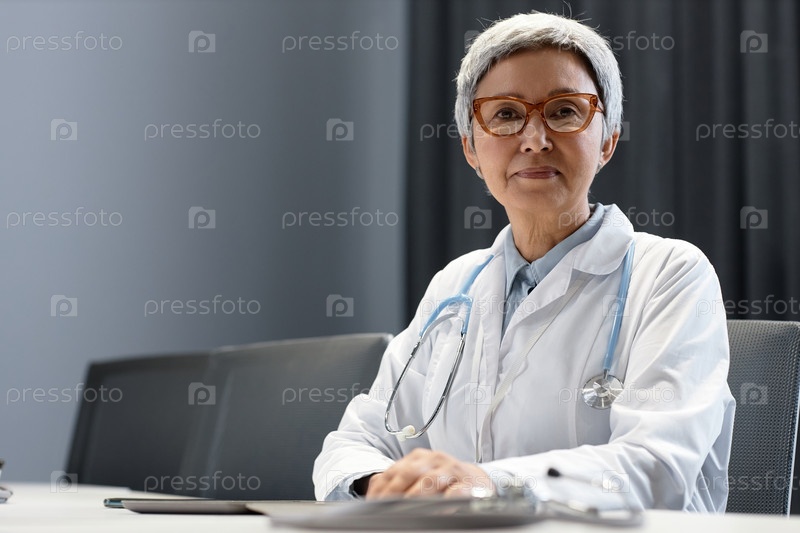 Опытный врач общей практики в лабораторном пальто и очках, смотрящий на камеру