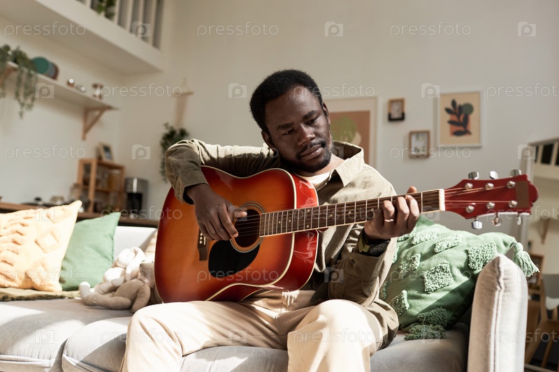 Молодой чернокожий мужчина играет на акустической гитаре в уютном доме