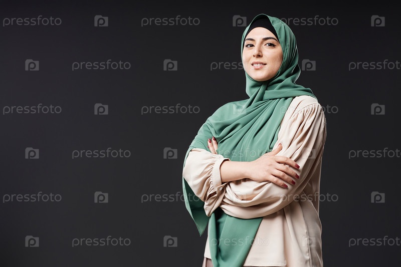 Уверенная в себе мусульманка носит скромную одежду на черном фоне
