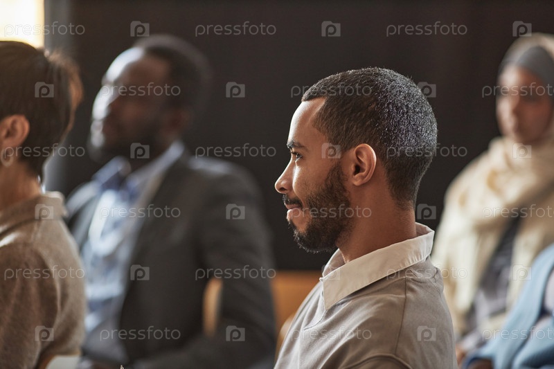 Боковой вид молодого бородатого мультиэтнического бизнесмена, слушающего динамика