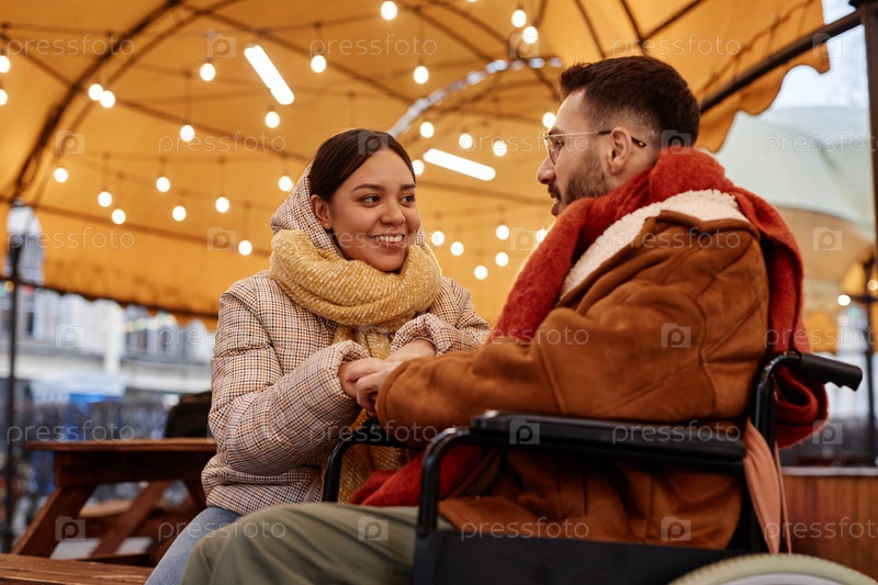 Улыбающаяся молодая женщина разговаривает с мужчиной-инвалидом на свидании зимой