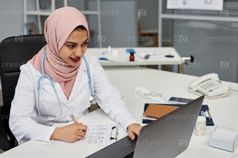 Женщина-генеральный врач, пишущая на карте пациента мусульманский