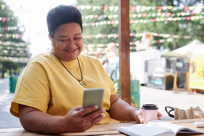 Современная чернокожая женщина пожилого возраста, использующая смартфон, работает на открытом воздухе и улыбается