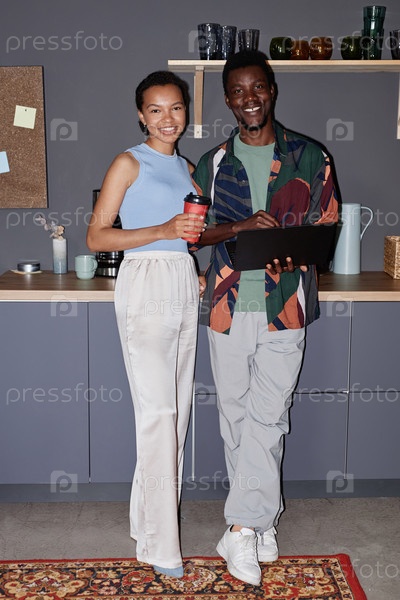 Чернокожие молодые люди мужчина и женщина, стоящие у кофейни в офисе