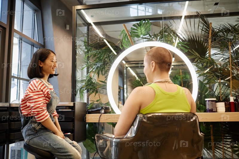 Молодые женщины поколения Z обсуждают стрижку в двух современных салонах красоты