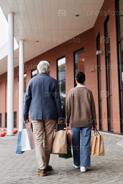 Пожилая пара с сумками для покупок вместе гуляет на улице в торговом центре