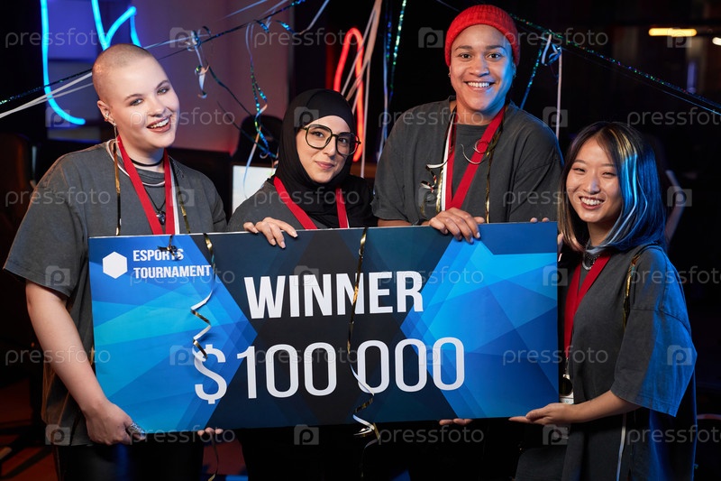 Группа молодых женщин, празднующих победу в турнире по киберспорту