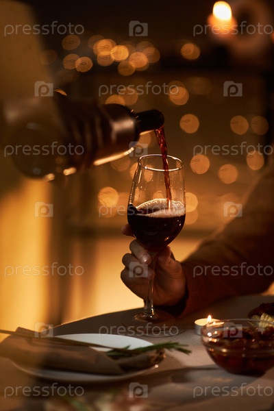Близкий снимок пары, наливающей красное вино в стакан во время романтического ужина