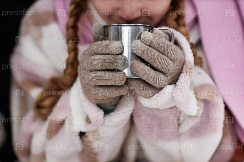 Близкий план девочки в серых шерстяных перчатках, держащей металлическую кружку с горячим чаем