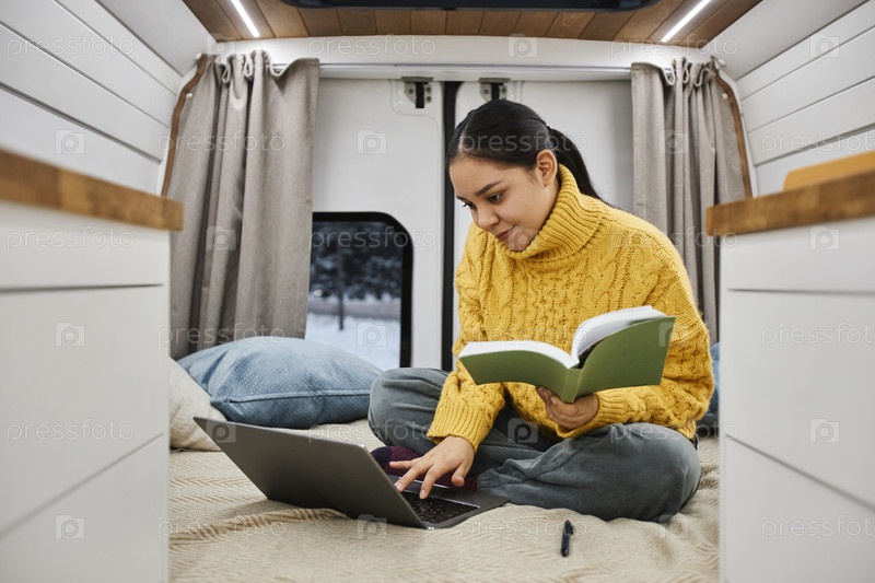 Молодая женщина использует ноутбук в фургоне-прицепе и работает на дороге