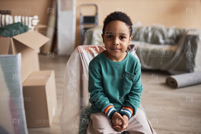 Милый мальчик в повседневной одежде сидит на новом стуле, покрытом целлофаном