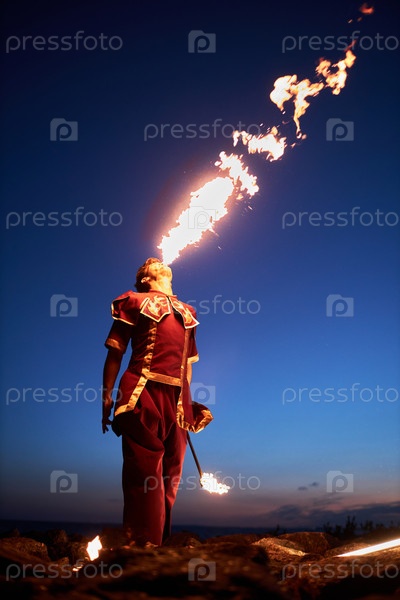 Исполнитель пожарного шоу дышит огнём