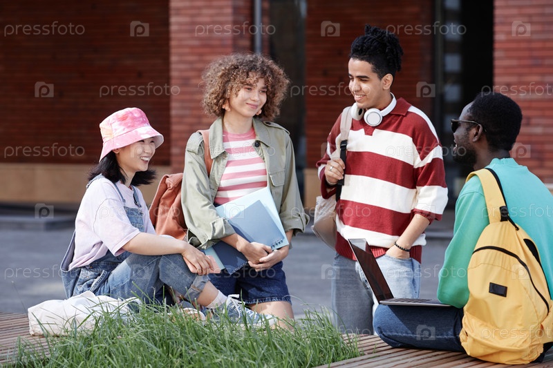 Разнообразная группа студентов, беседующих на улице в кампусе и улыбающихся