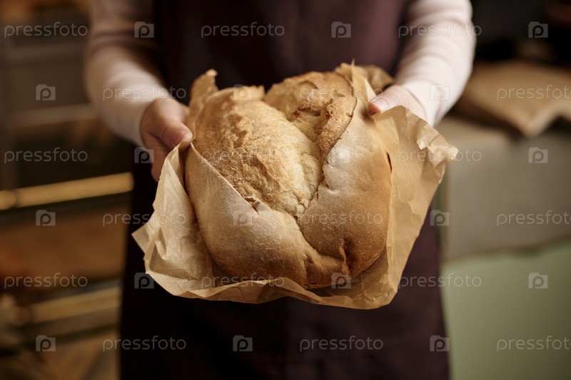 Близкий план молодой женщины, тщательно держащей свежий хлеб в ремесленной пекарне