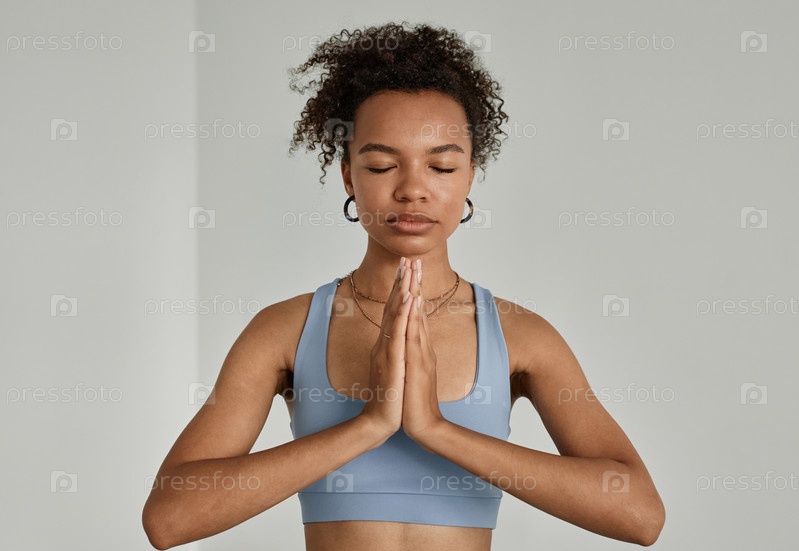 Молодая афроамериканка медитирует с закрытыми глазами в йога-студии