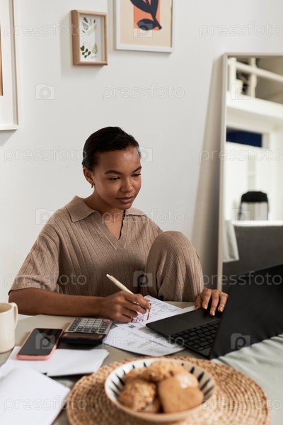Молодая чернокожая девушка делает налоги дома