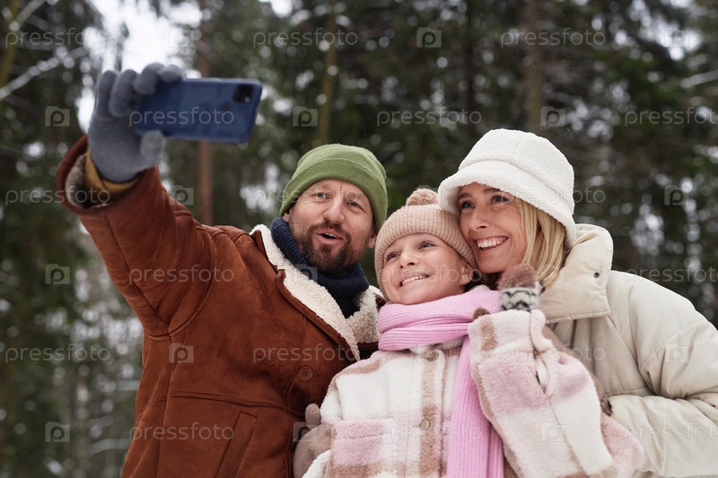Молодой человек со смартфоном делает селфи со своей счастливой женой и дочерью