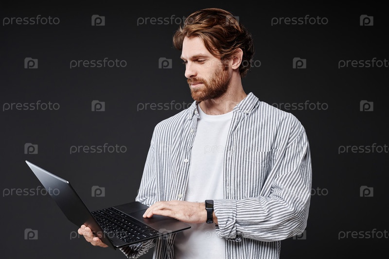 Мужчина держит открытый ноутбук, стоящий на черном фоне