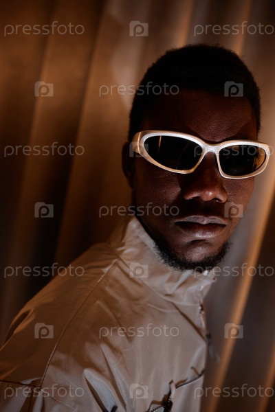 Закройте молодого чернокожего мужчину, носящего солнцезащитные очки в стиле 90S и смотрящего на камеру