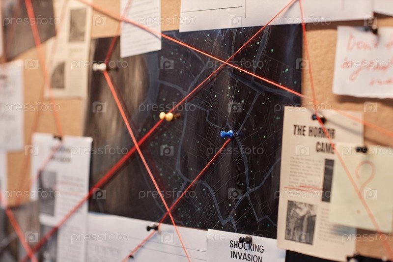 Доска доказательств вблизи с красной нитью, соединяющей карту и фотографии
