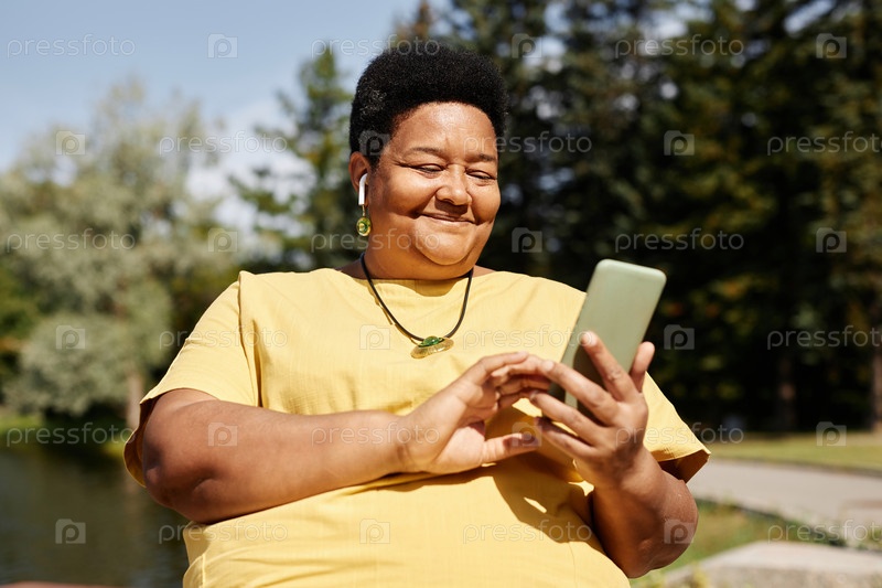 Чёрная пожилая женщина, использующая смартфон, расслабляется на скамейке в парке, освещенном солнечным светом