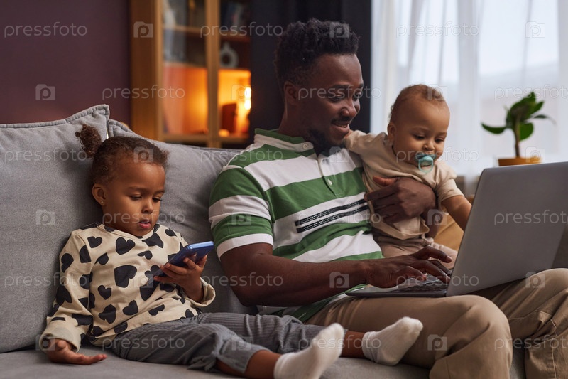 Работающий отец с двумя детьми использует ноутбук и улыбается, наслаждаясь воспитанием детей
