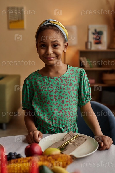19-летняя чернокожая девушка стоит за обеденным столом