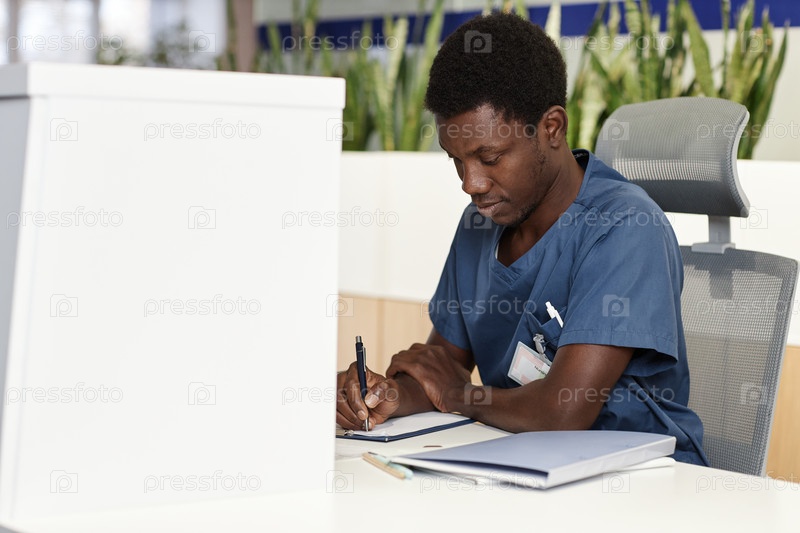 Молодой афроамериканский врач-мужчина или администратор клиник, делающий заметки
