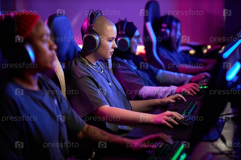 Мультиэтническая группа женщин, играющих в видеоигры подряд как команда киберспорта