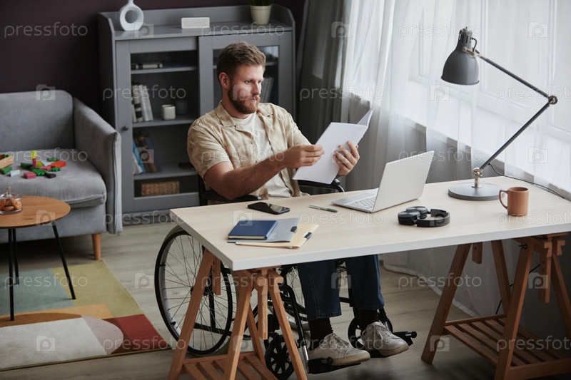 Человек, использующий инвалидный стул Работает из дома и читает документы за рабочим столом