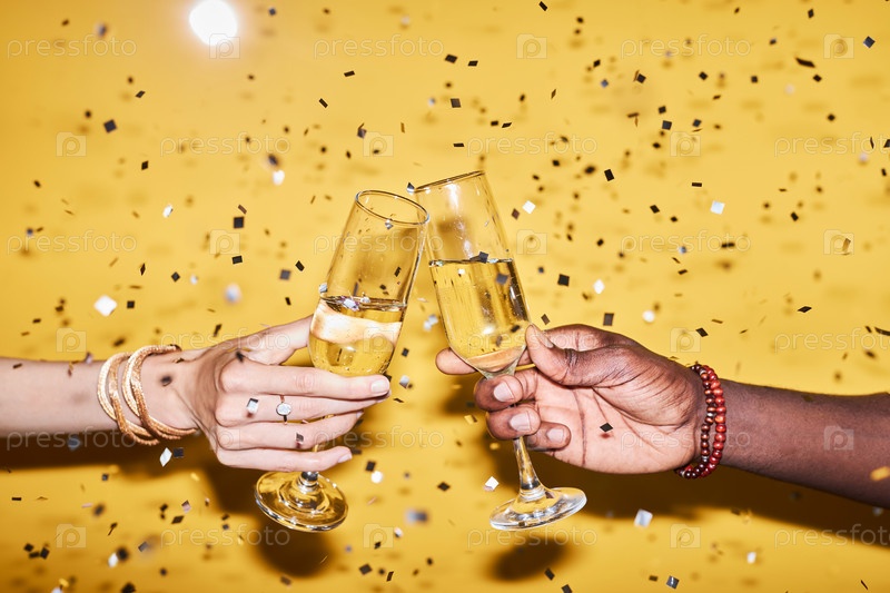 Две руки, стучащие бокалы шампанского на желтом фоне с конфетти