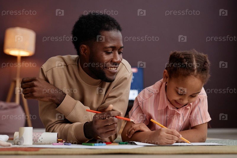 Отец и дочь рисуют картины, лежащие на полу дома и счастливо улыбающиеся