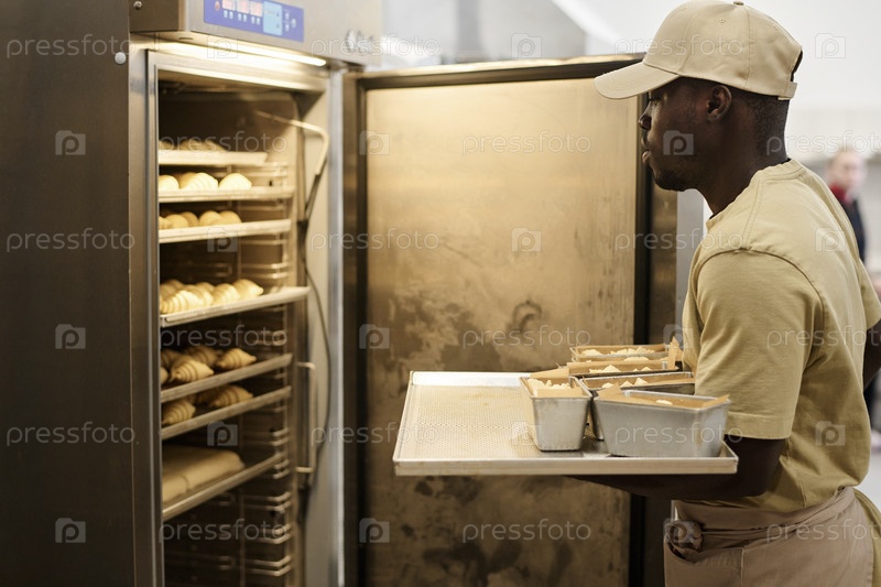 Молодой чернокожий мужчина кладет свежую выпечку в морозильник на кухне пекарни