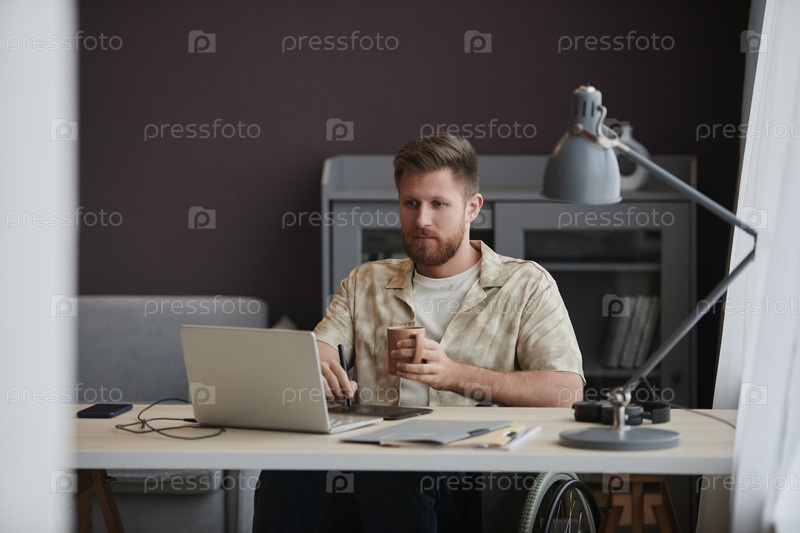 Мужчина с инвалидностью работает из дома и использует ручку-таблет