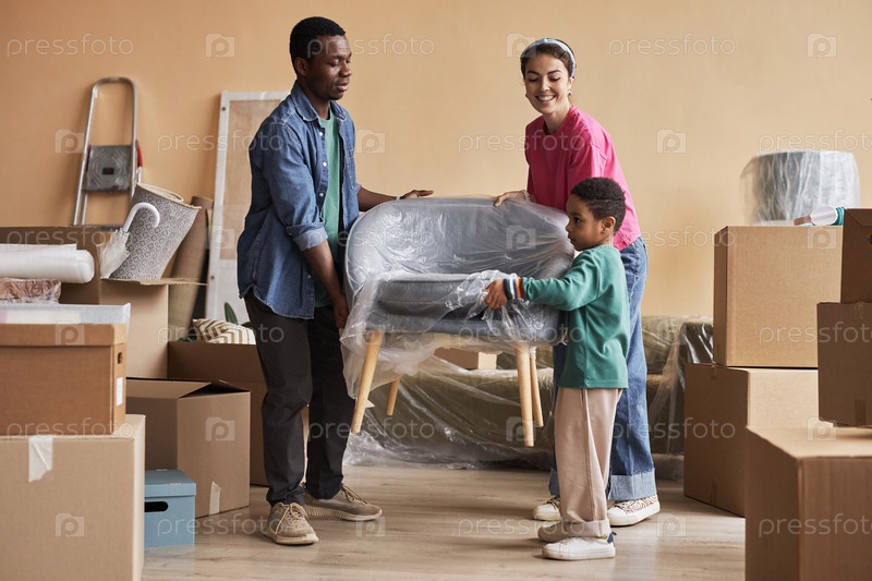 Молодая межкультурная пара и их маленький сын, несущие новый кресло