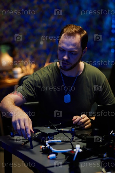 Молодой военный офицер строит дрон, сидя у рабочего места