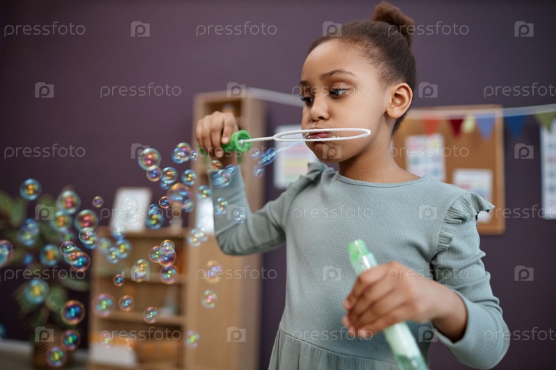 Девушка дует мыльные пузыри в помещении и весело проводит время