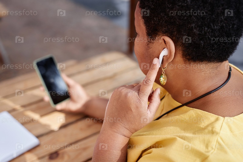 Ближайшее изображение современной чернокожей старшей женщины, прослушивающей беспроводные наушники