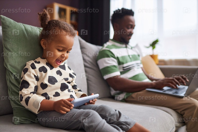 Маленькая маленькая девочка использует смартфон дома с отцом, работающим на заднем плане