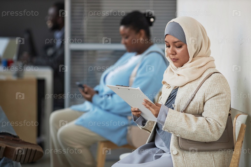 Молодая мусульманка в хиджабе читает заявку, сидя в очереди