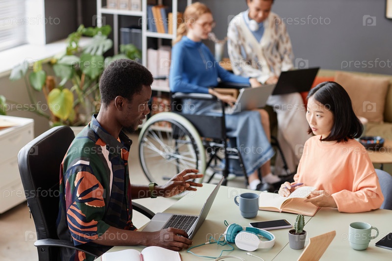 Красочные два молодых профессионала, сотрудничающих над проектом за столом заседания
