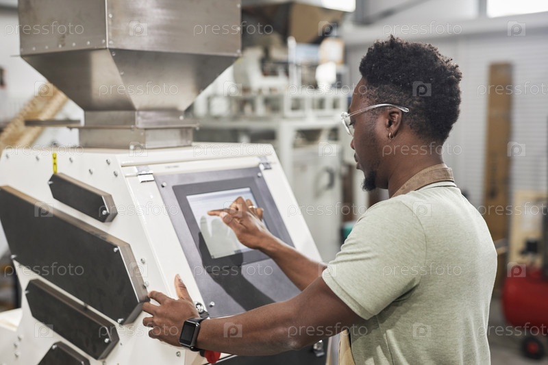 Вид чернокожего человека, использующего панель управления сенсорным экраном на заднем плане в мастерской пищевой фабрики