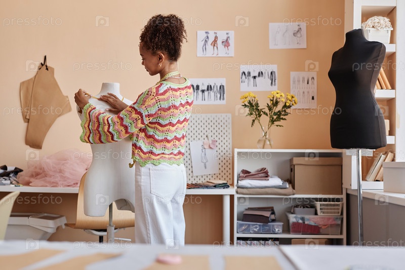 Молодая стилистка стоит перед манекеном в мастерской