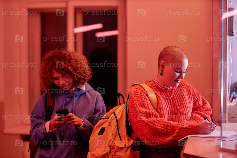 Белая молодая женщина, входящая в общежитие или колледж спальни с неоновыми огнями