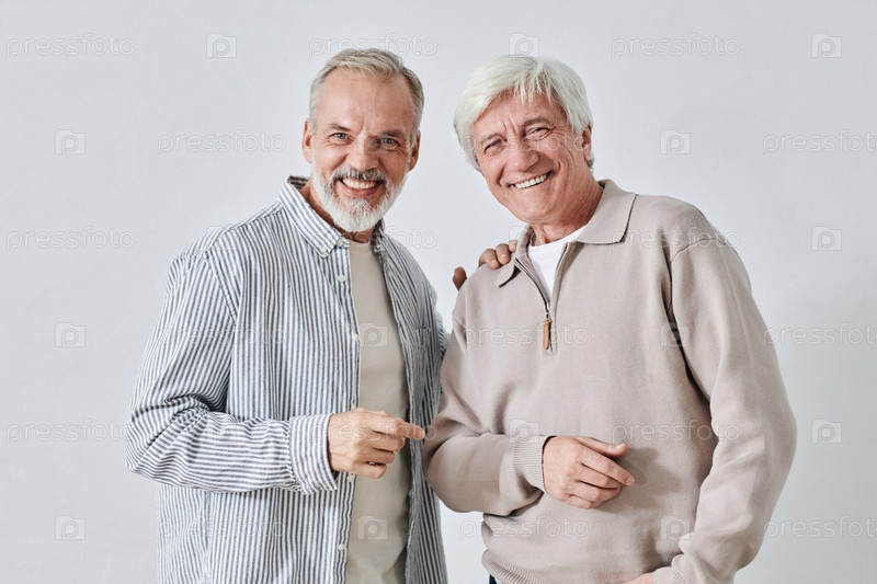 Старшие мужчины смеются и смотрят на камеру