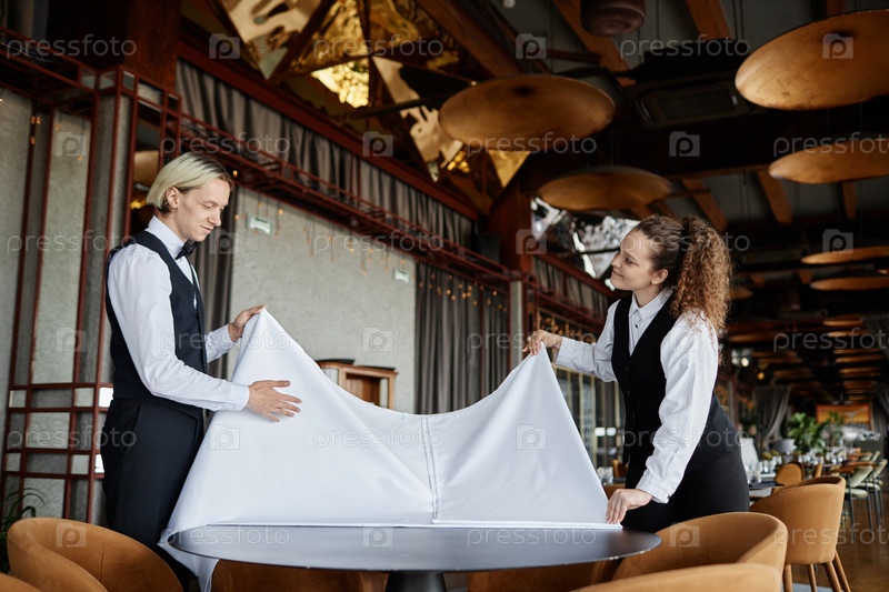 Два элегантных сервера, покрывающие столы белой скатертью и готовящиеся к открытию