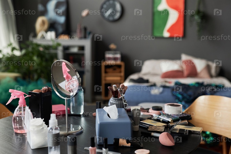 Бешеный макияжный стол со зеркалом и предметами красоты