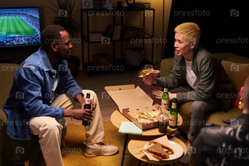 Два молодых друга разговаривают на домашней вечеринке
